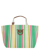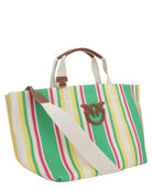 Colorata, pratica e irresistibilmente estiva: la shopper media PINKO è realizzata in tela di cotone jacquard con un disegno a righe multicolor, perfetto per evocare lo spirito del mare e delle vacanze.